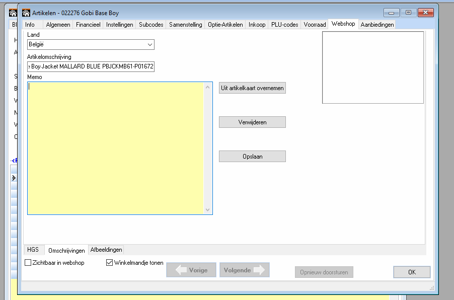 Om te zorgen dat dit zo wordt weergegeven op de webshop dient in Winpos, onder het tabblad ”Webshop”, de Artikel-omschijving als volgt te worden ingevuld